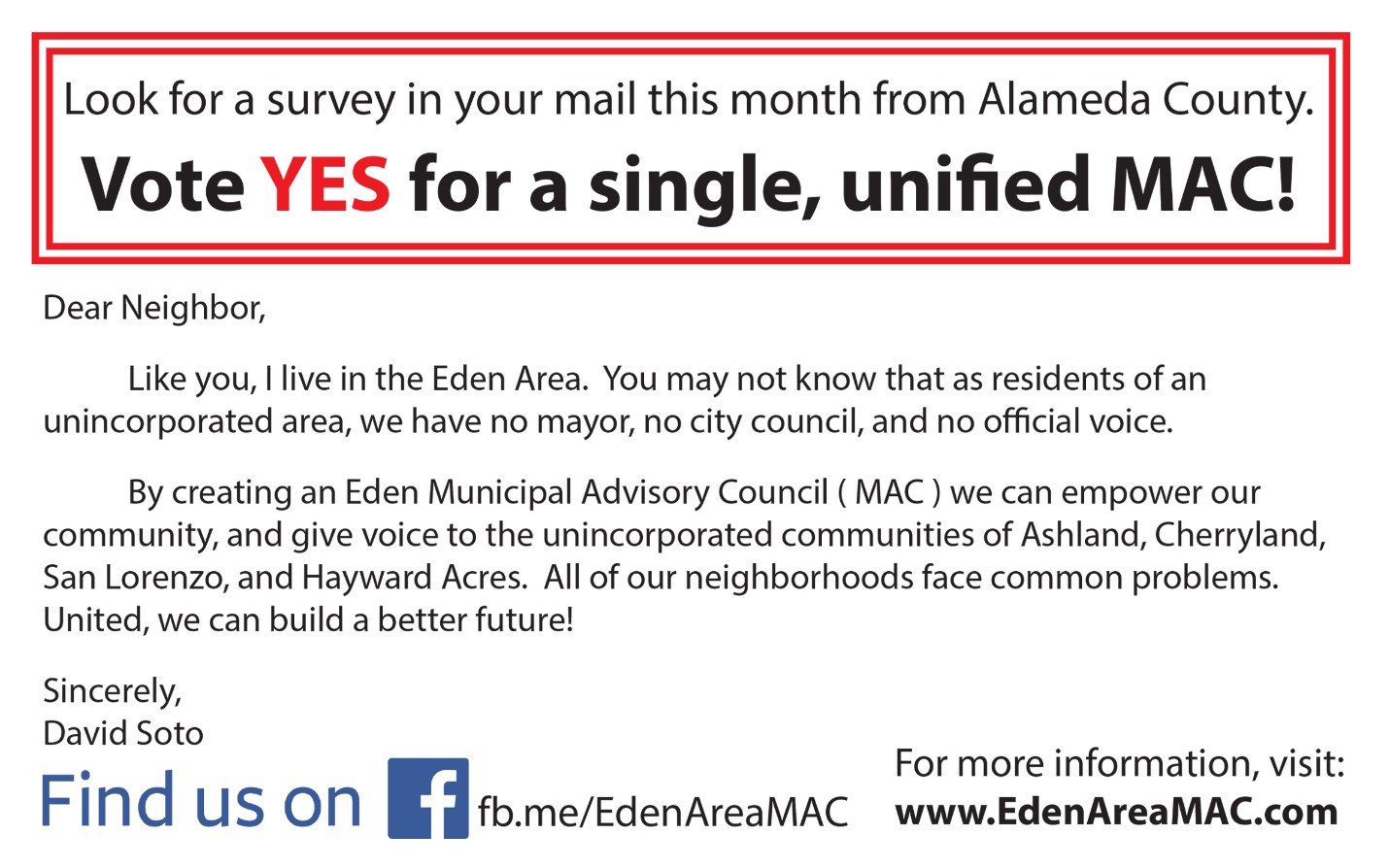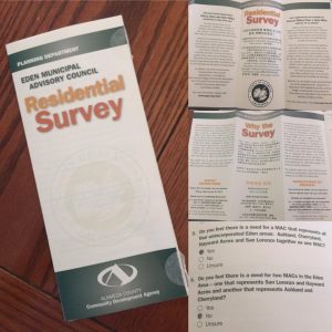 The organizing team is asking everyone who lives in Ashland, Cherryland, San Lorenzo, or Hayward Acres to complete the survey (pictured above) from the county has been sent out to your home. Residents who would like a body who could advocate for better roads, jobs, and other community needs should fill it out with a YES on question number 5, and a NO on number 6. These questions will determine whether or not the Eden Area get a Municipal Advisory Council.